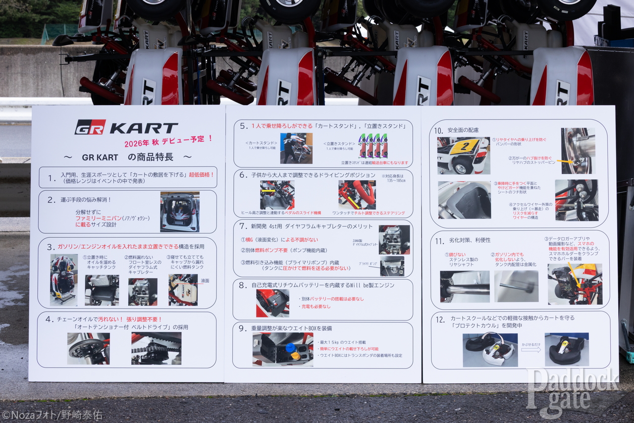 既報の通りGRカートはトヨタ自動車が開発を行う入門者向けカートです。GRカート担当のトヨタ自動車株式会社 GR車両開発部 主査 伊東直昭氏に取材したところ、「GRカートの位置付けは現在のSLレースの更に下のレベルであり、現在のレーシングカートに置き換わる存在ではありません」とのこと。GRカートは入門者向けという明確なコンセプトを持ち、それにふさわしい性能と取扱の手軽さを併せ持ちます。