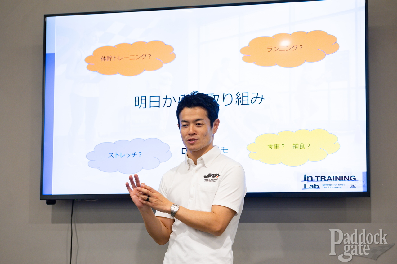 トップ選手も使用する専門機器を用い、筋力、柔軟性、瞬発力、反射神経などを詳細に数値化しました。 測定後は、中島氏から「この数値が低いとレース後半で疲れが出る」といった具体的なフィードバックを実施。選手たちは配られたメニューをこなすのではなく、自身の弱点を客観的に把握した上で、「自分にはどんなトレーニングが必要か」をトレーナーに積極的に質問し、自ら課題解決に取り組む姿勢が見られました。